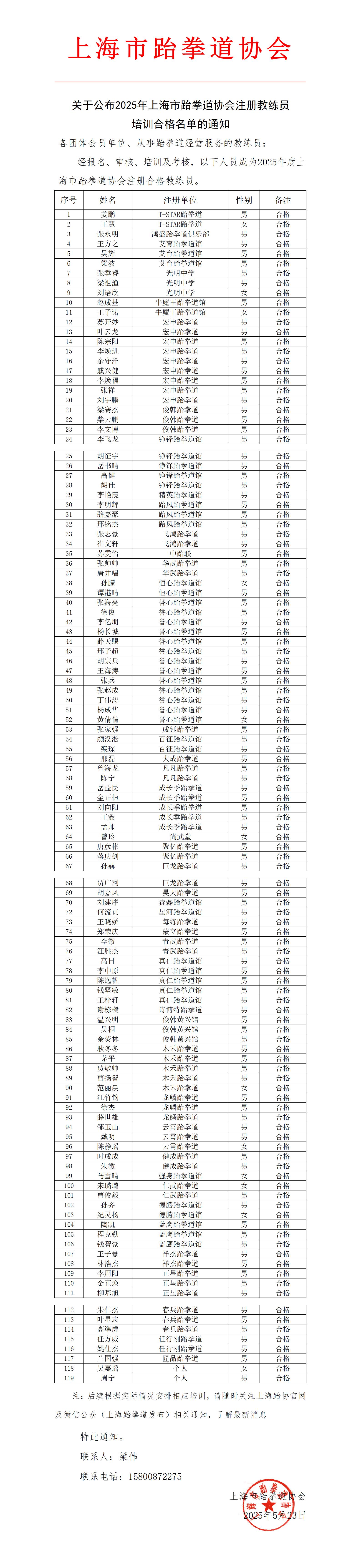 关于公布2025年上海市跆拳道协会注册教练员培训合格名单的通知