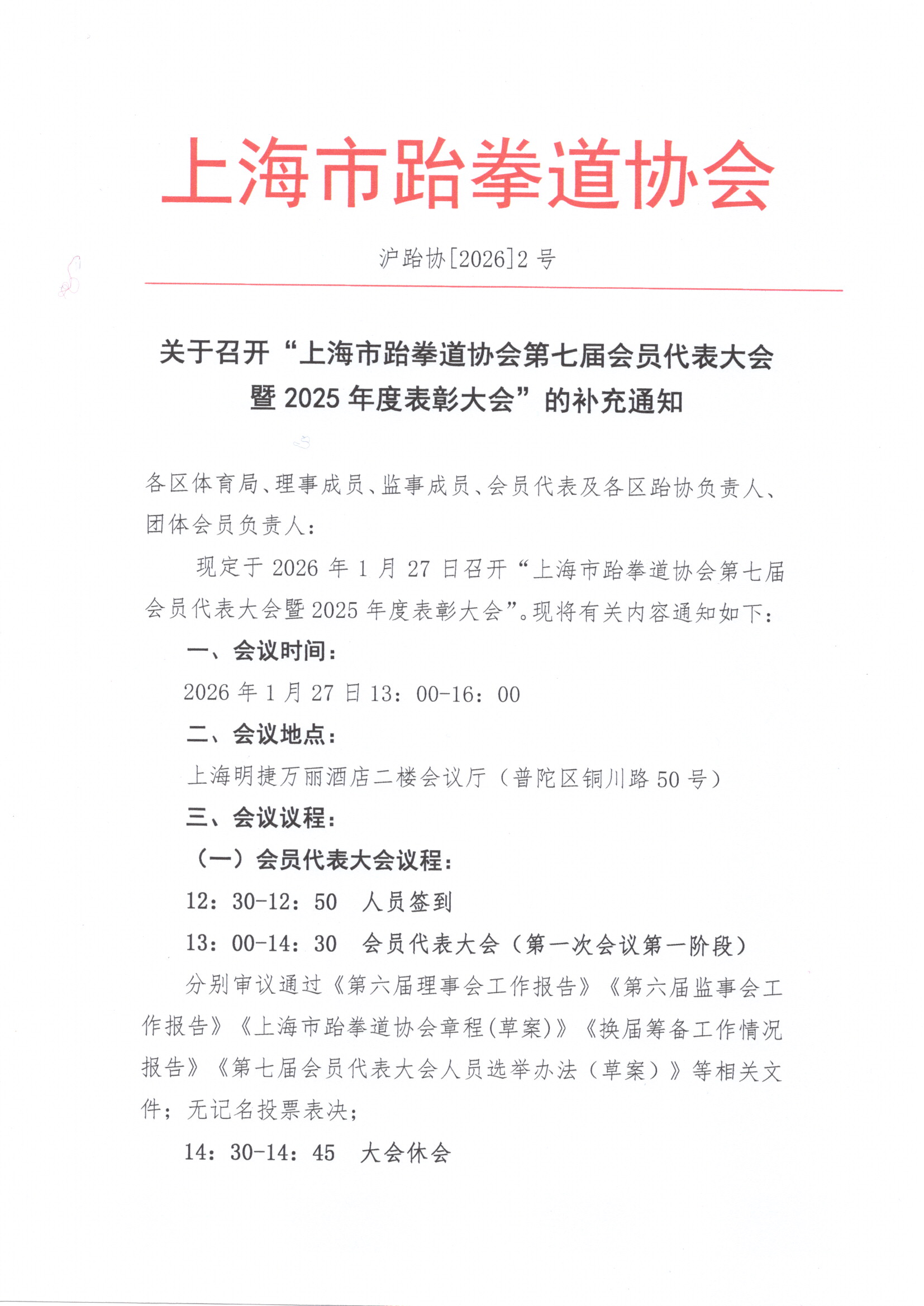 关于召开“上海市跆拳道协会第七届会员代表大会暨2025年度表彰大会”的补充通知